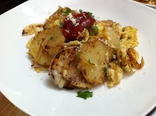 - When potatos start to blacken and soften add scrambled eggs to pan. Sprinkle with a touch of parmesan cheese.