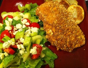 What’s better than fried chicken? Nothing. But let’s face it, fried foods are not good to eat on a regular basis. I have made many adaptations of Ellie Kreiger’s oven fried chicken recipe but tonight’s was the best! Really, you can make it any way you want but you have to know the trick- and that is greek yogurt.
