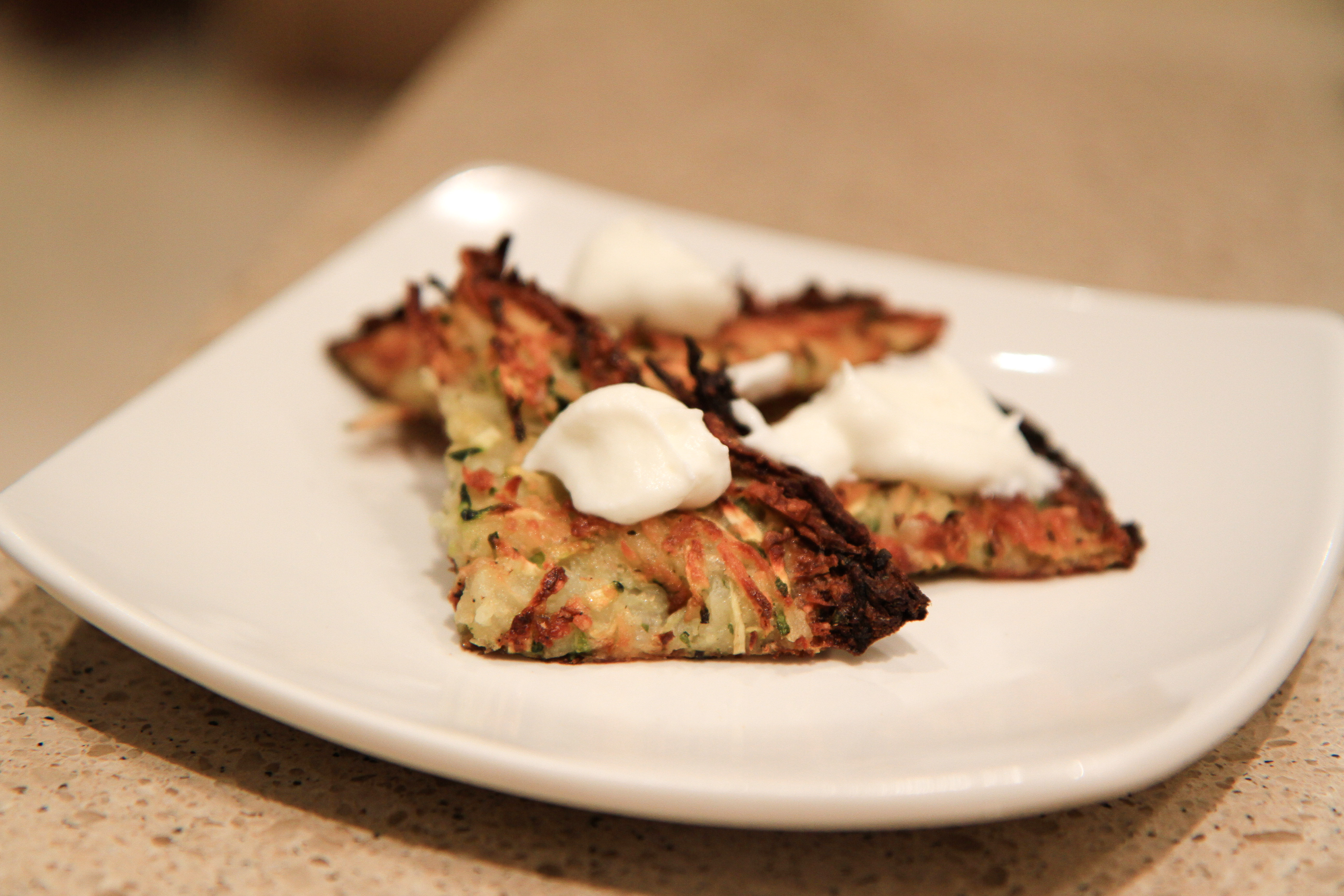 Giada’s recipe can be found here: http://www.foodnetwork.com/recipes/giada-de-laurentiis/crispy-zucchini-and-potato-pancakes-recipe/index.html