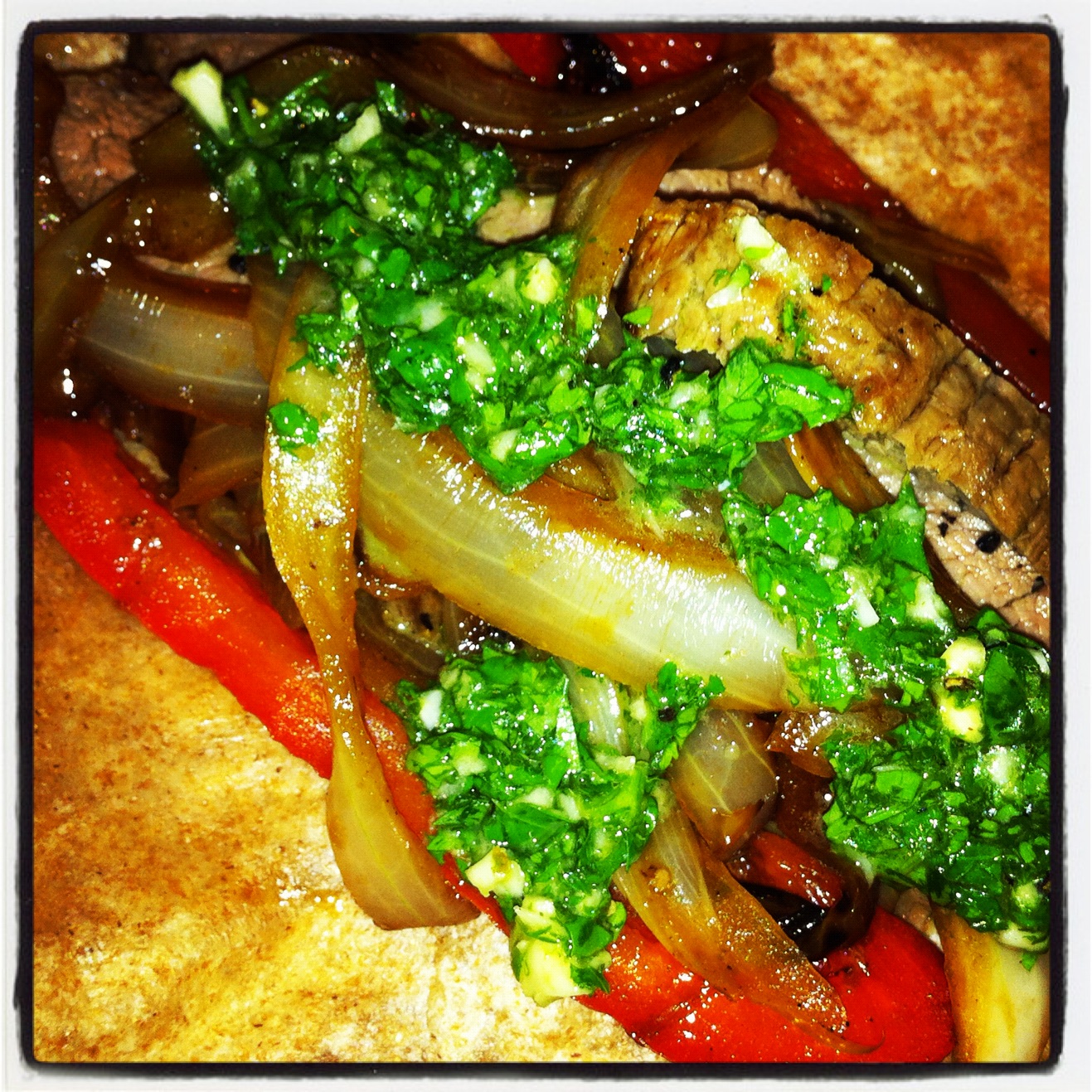 Heat up your tortilla, place a few strips of beef, peppers & onions, and top with chimichurri. Enjoy!