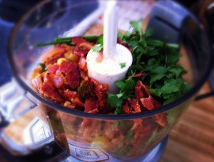 - Remove from heat and let cool for a few moments in the food processor. In the mean time cook a slice of bacon on the pan. Soak up any excess grease. Add chorizo mixture, bacon and fresh cilantro in the food processor and blend together.