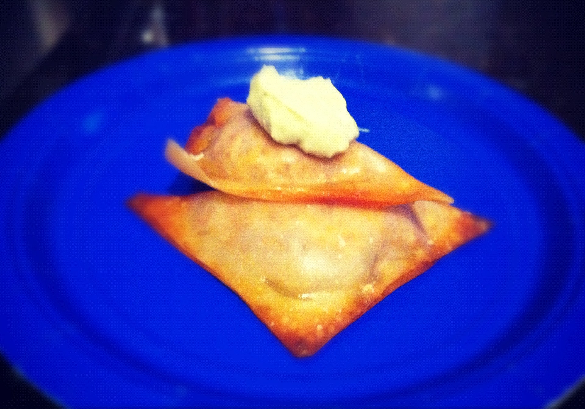 - Take out a wonton wrapper and place 1 spoon full in the center. Dip your finger in water and wet the edges. Then fold it in half.