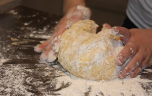 Once you have incorporated all the ingredients, sprinkle some extra flour on the counter and knead the dough. You will probably have to put some flour on your hands so it doesn’t stick. You should work the dough for quite a few minutes with your hands. Then place it in a bowl with a dash of olive oil and cover the bowl with a towel. Let it rest.