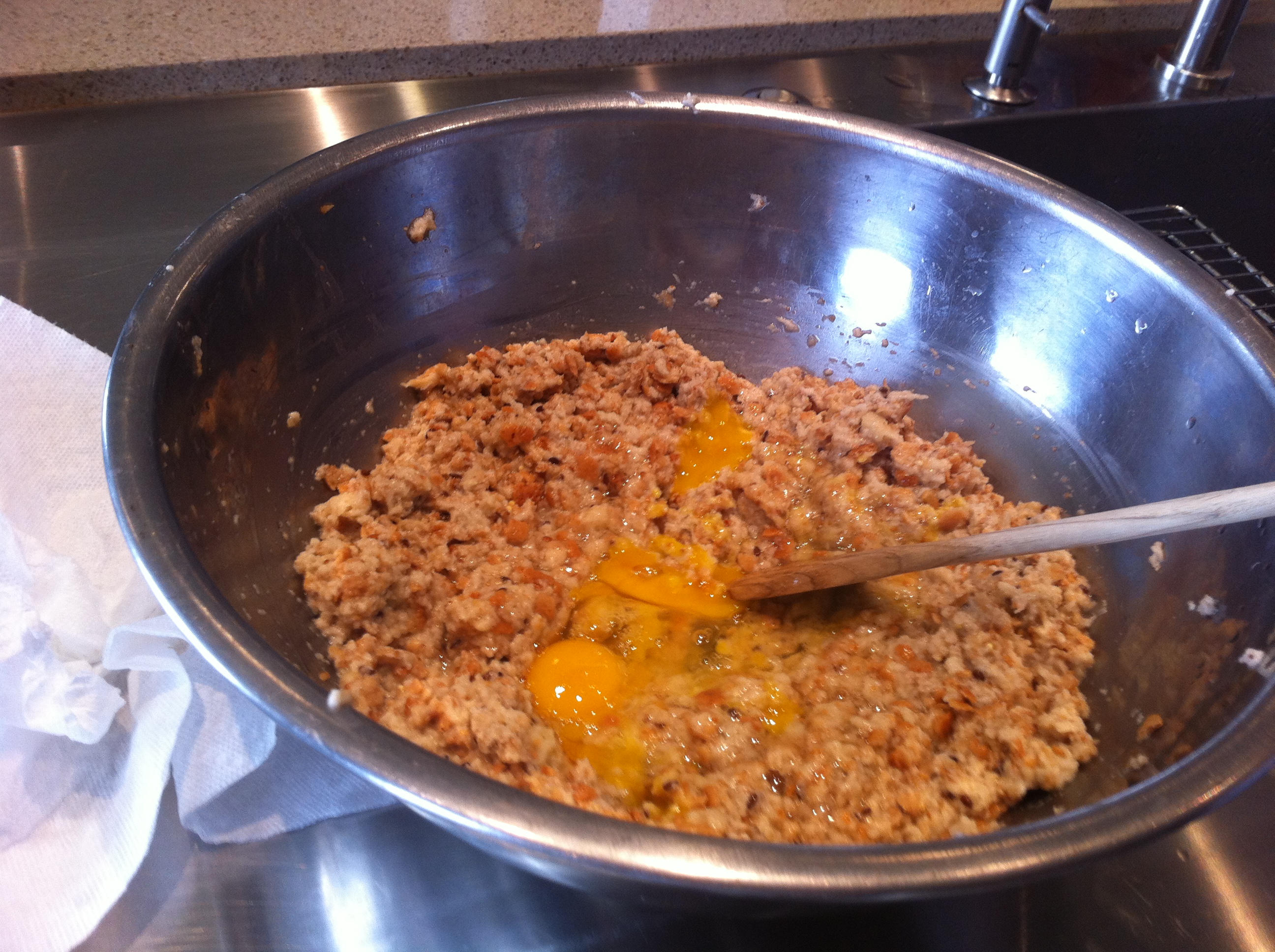 Add in chopped garlic and parsley. Nanny uses the “smell test” to know when the mixture is just right. Then add in the salt, pepper, cheese and mix well. Add in the eggs and combine using a wooden spoon. Make sure it smells right 😉