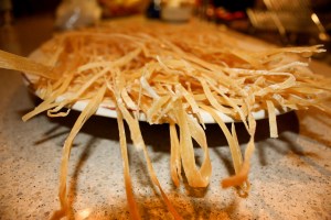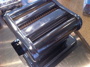 To prepare, lay a clean sheet on a big table and sprinkle some flour on it. Take out your handy pasta machine. Feed the first sheet through the machine twice on the 8 setting, then once on 6, once on 4 and once on 2. Repeat with every sheet of pasta. When your done, get the other half of your dough and do the same. We found this was a multi-person job and had a lot of fun while doing it. It can be done alone once you get the hang of it but it’s nice to have an extra pair of hands.