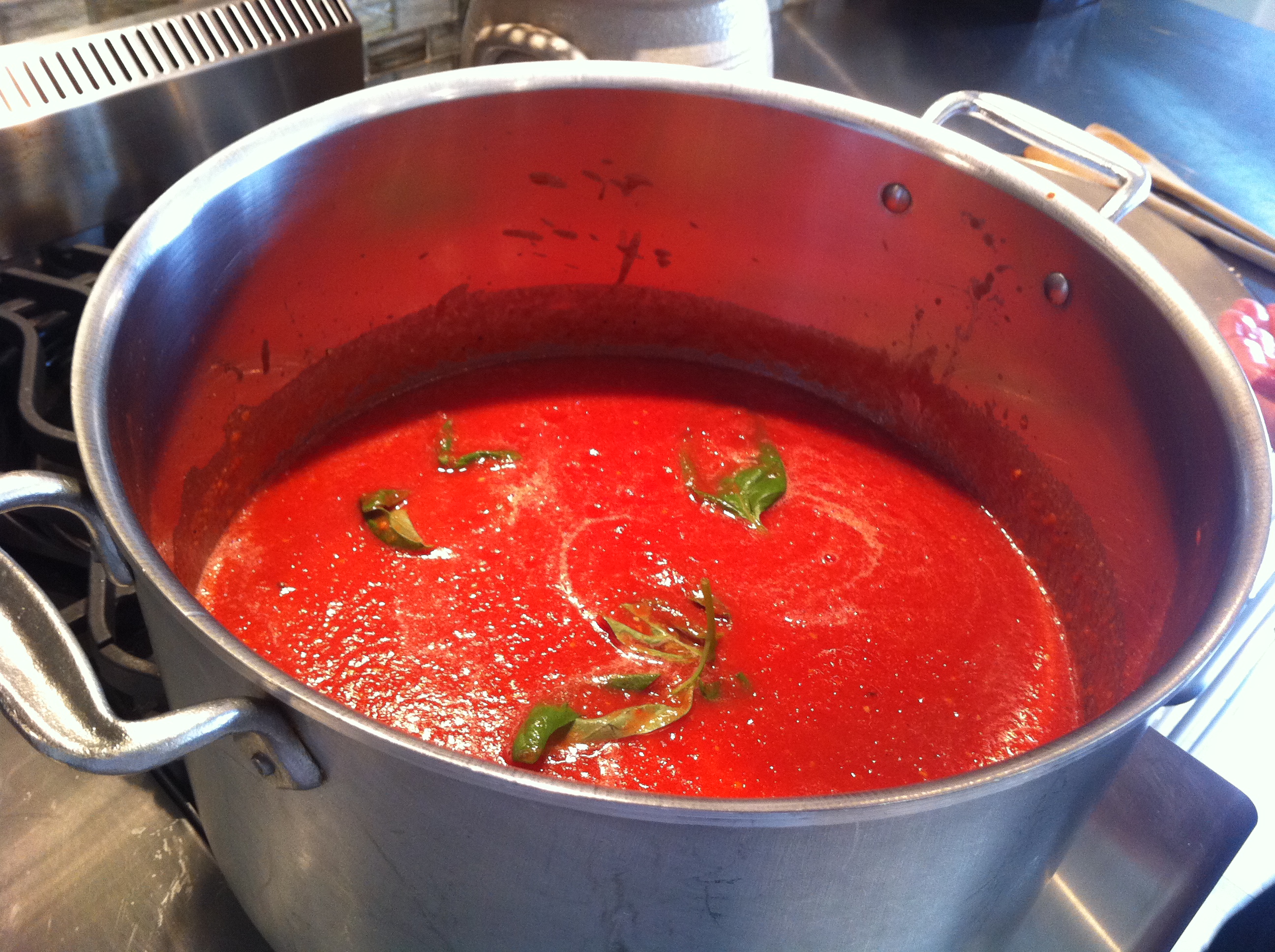 Take a few large cans of san marzano whole tomatoes and pour in your large pot on the stove. Add a few garlic cloves. Using a hand-held blender puree the tomatoes together. Then add a handful of kosher salt, a lot of fresh cracked pepper, and 3-4 fresh basil leaves. Bring to a boil and then reduce to simmer.