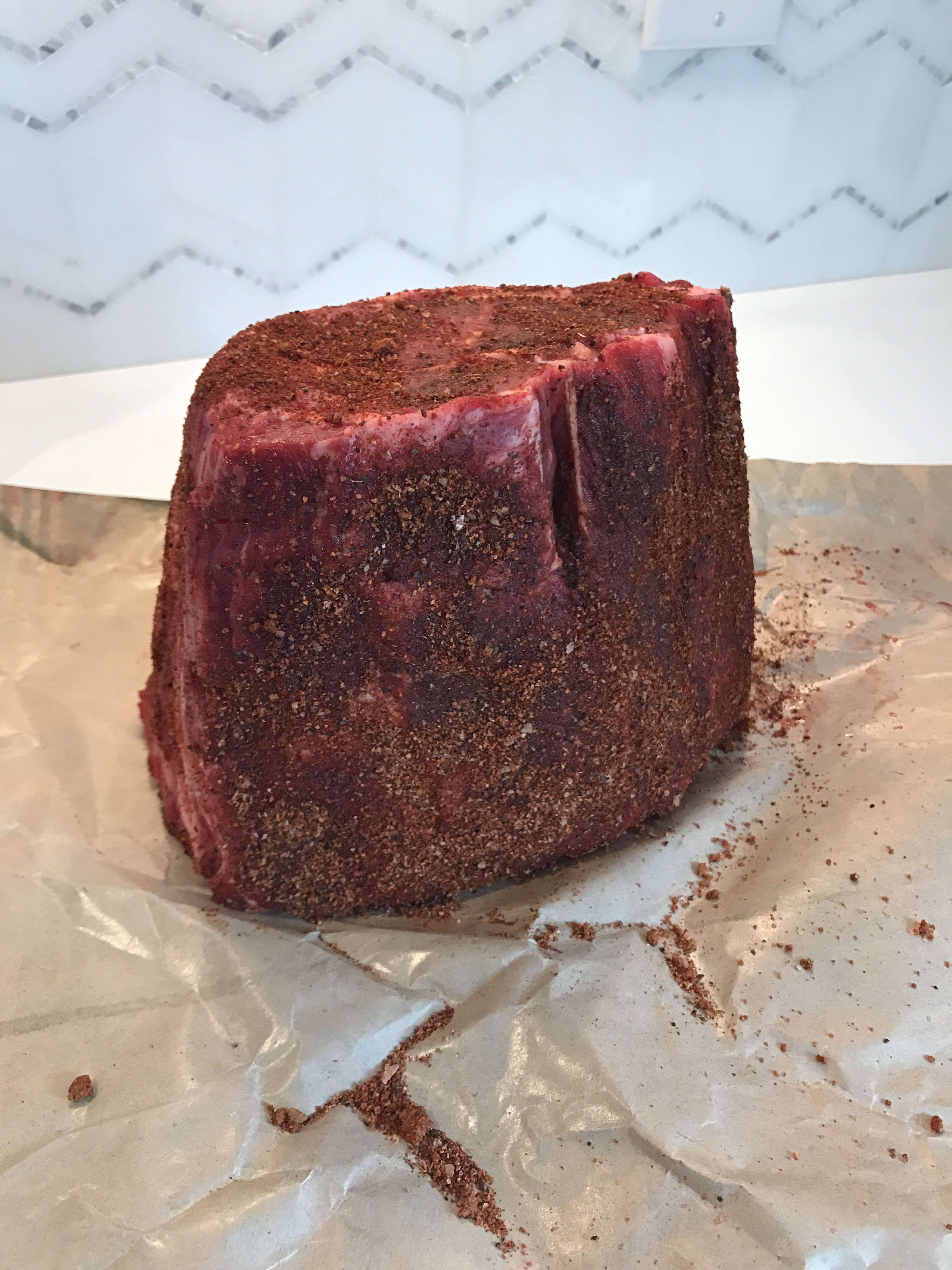 - Optional: Buy the beef the night before and put a rub on it (salt, pepper, chili powder, garlic powder, onion powder, coriander, cumin, cayenne pepper) and place in the fridge over night.