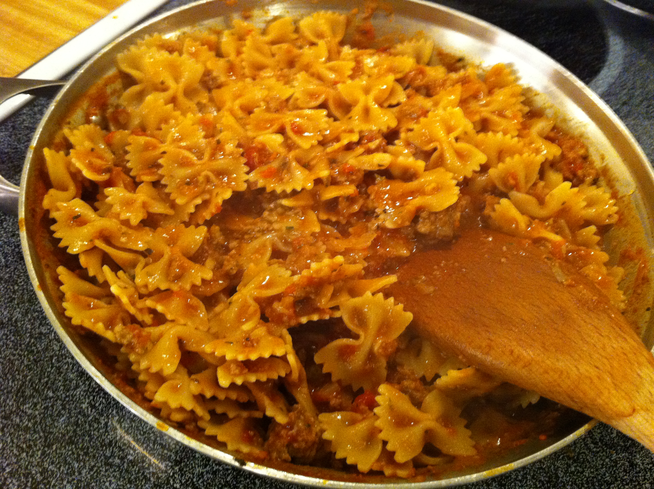 Chop up the meatloaf with a wooden spoon in a pan on the stove, add some left over tomato sauce, or canned tomatoes (then I would add more garlic) and serve with whole wheat pasta and fresh grated cheese. (I do recommend using the medium sized whole wheat shells but I was out). I added some red wine and dried herbs since I was out of fresh basil. Any of your favorite spices will do.