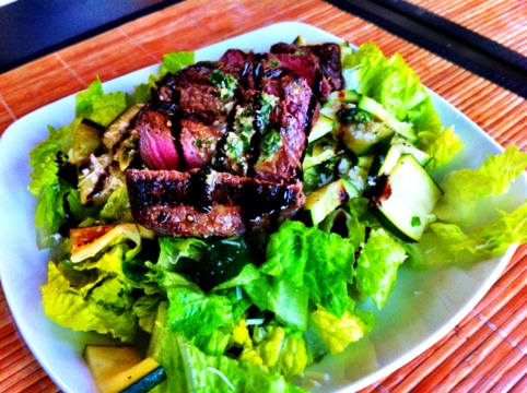 Meanwhile, wash and chop romaine lettuce and place in bowl. Chop zucchini into bite sized pieces and sprinkle on top. Add a sprinkle of Parmesan cheese. Slice the steak and place on the salad. Spoon the salad dressing over the entire plate.