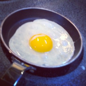 - Spray your pan again if necessary. Turn to med-high heat. Crack one egg into your pan and let cook. Sprinkle with salt and pepper. After about 2 minutes, using a spatula, flip the egg to finish for another minute.