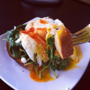 - Put your piece of toast on your plate and add the spinach on top. Sprinkle in feta cheese and place the egg on top. Add a few dashes of hot sauce and you’re ready to dig in.