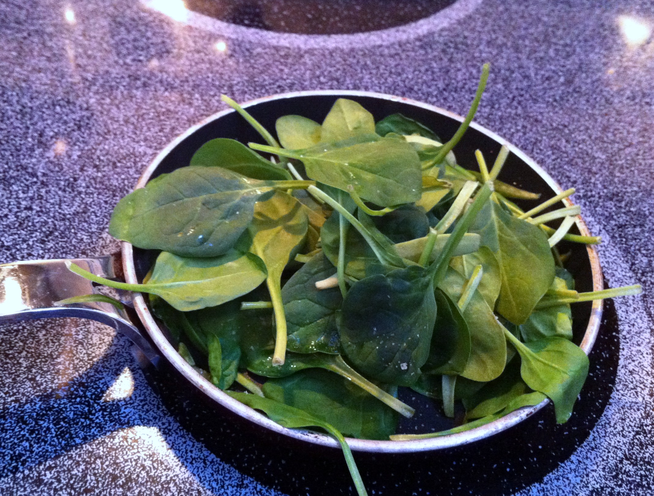 - Spray a small non stick pan with olive oil using your misto. Put the pan on high heat. Add the spinach, with salt, pepper and a dash of garlic powder and let it cook for a minute. Set aside.