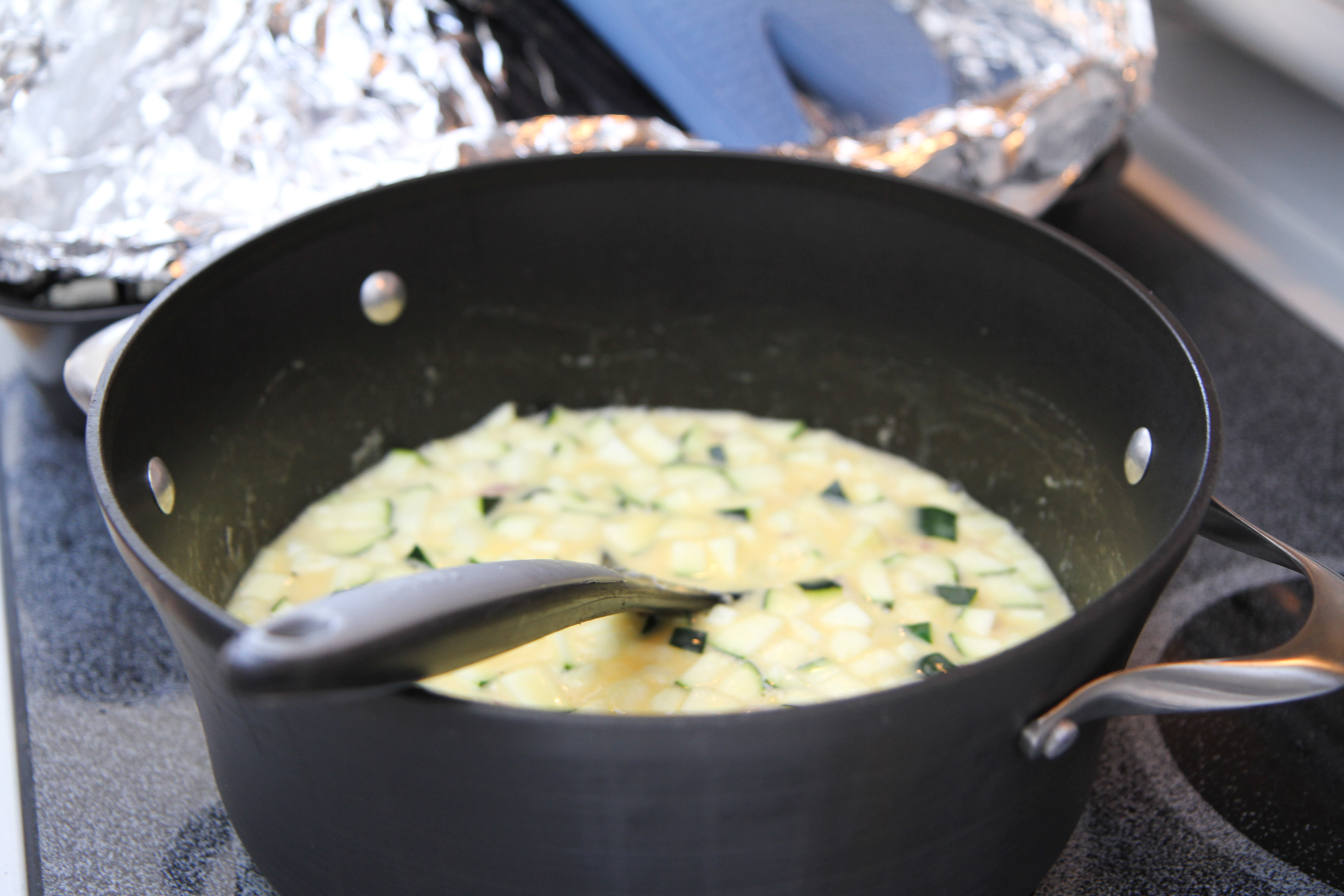 - Put a pan on the stove on medium heat and melt butter. Add the zucchini and shallots and saute for a few minutes. Add salt & pepper.