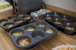 - When you have filled all of your cupcakes, spray with olive oil and bake for half hour or so, until the edges are browned. You can do this in advance and set them aside until you are ready to bake the eggs and eat. As you can see in the photo I was skimpy on some with the potatoes so I added a little more to cover the holes knowing they would cook more in the oven.