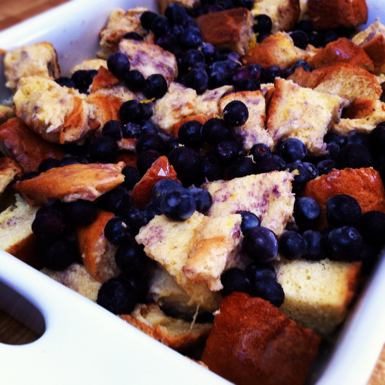 Here is Giada’s recipe! I made two large casserole dishes with 2 1/2 loaves of challah and 2 bags of frozen blueberries (the fresh ones didn’t look great).