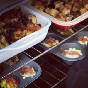 Here is our Easter brunch in the oven, Challah French Toast and Eggs in a Basket.