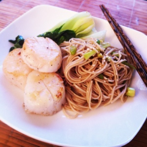 This was my first time making soba noodles and I have no idea why I never made them before. The recipe is surprisingly easy to make even though I used a lot of ingredients. Its sweet and a tad spicy but very refreshing on a hot summer night. It also turns out these noodles have less calories than regular white flour pasta! The baby bok choy is prepared in a basic sauté and is a nice crunchy vegetable on the side. Overall, it was a great dinner with a nice balance of flavors. We both gave it two thumbs up. My favorite was the noodles and Kyle voted for the scallops.