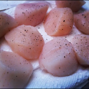 Wash and pat dry the scallops. Add fresh cracked salt and pepper.