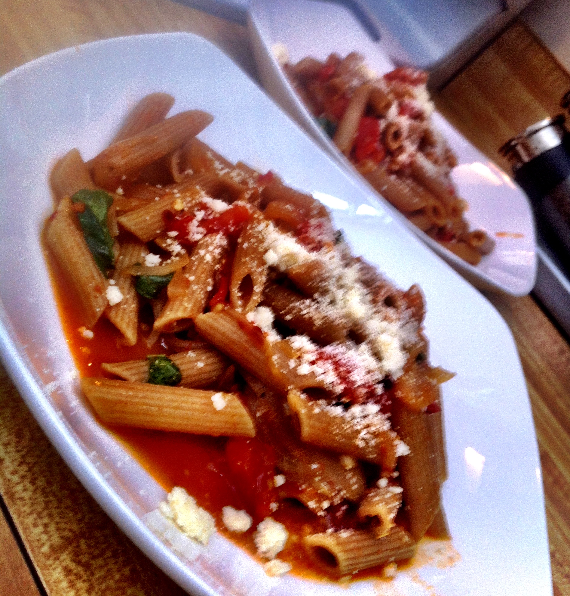 My friend Sarah participated in a CSA this year that gives her locally grown produce every week. She gave me a bag of tomatoes she couldn’t get through that were absolutely delicious. It’s rare to get a really good tomato anymore so when I do, I will usually just sprinkle salt on it and eat it like an apple! But since I had this big bag of beautiful tomatoes and not much in the fridge, I decided to make a quick sauce for lunch this weekend. It’s fresh from the garden- a little bit sweet and creamy balanced by a dash of spice!
