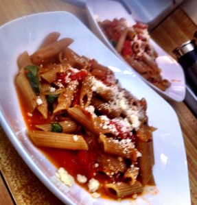 - Put a pot of boiling water on for the pasta. When it comes to a boil add the penne and cook until al dente. It should take about the same amount of time to finish the sauce.