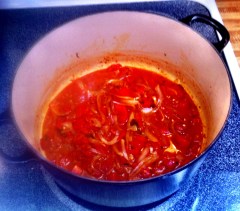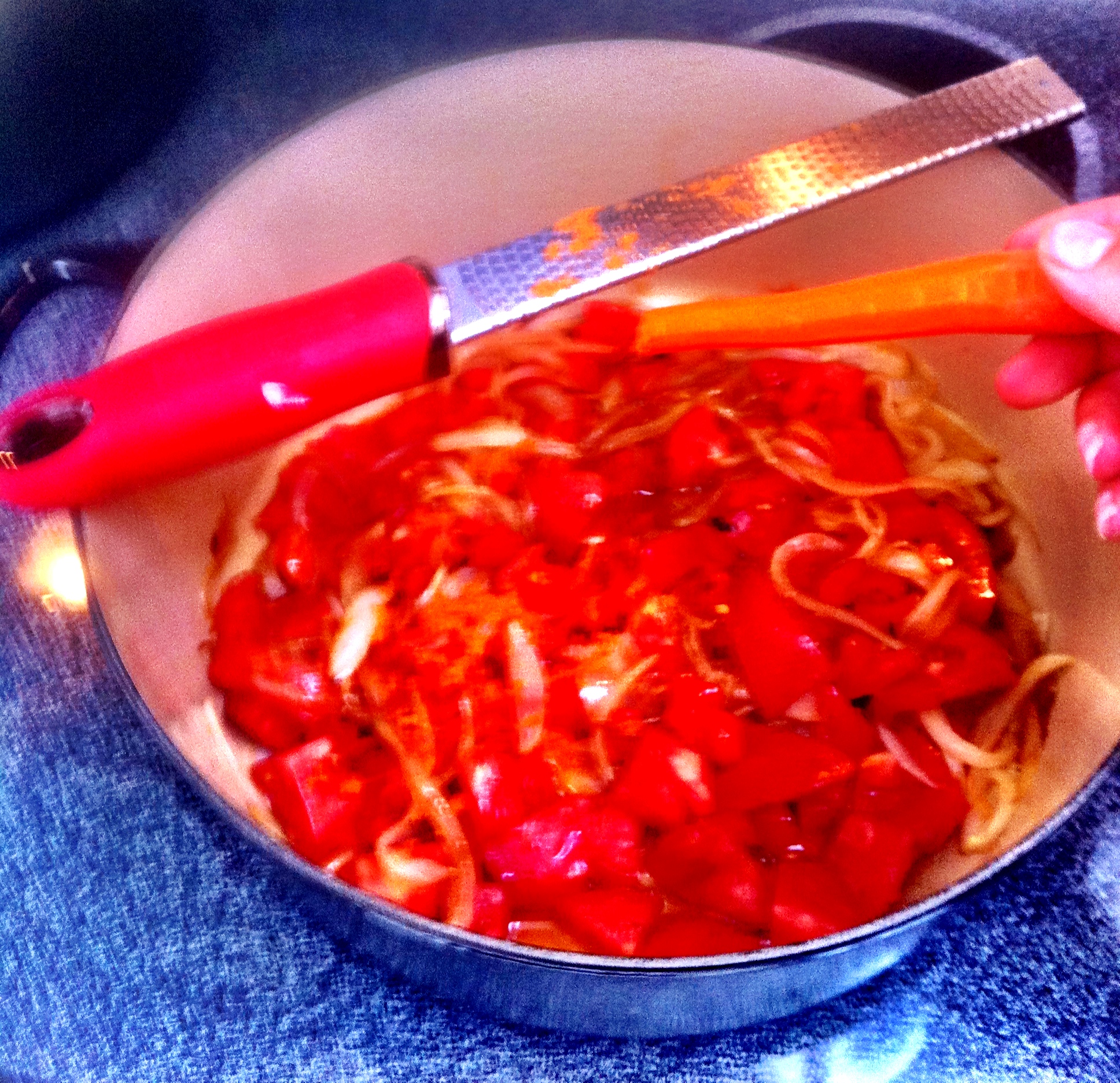 - Grate one carrot into the pan. It will take away the bitterness of the tomatoes and add hearty flavor. (I often throw a whole carrot in my pot of sauce while its cooking and remove it before serving.) Then add the chopped garlic.