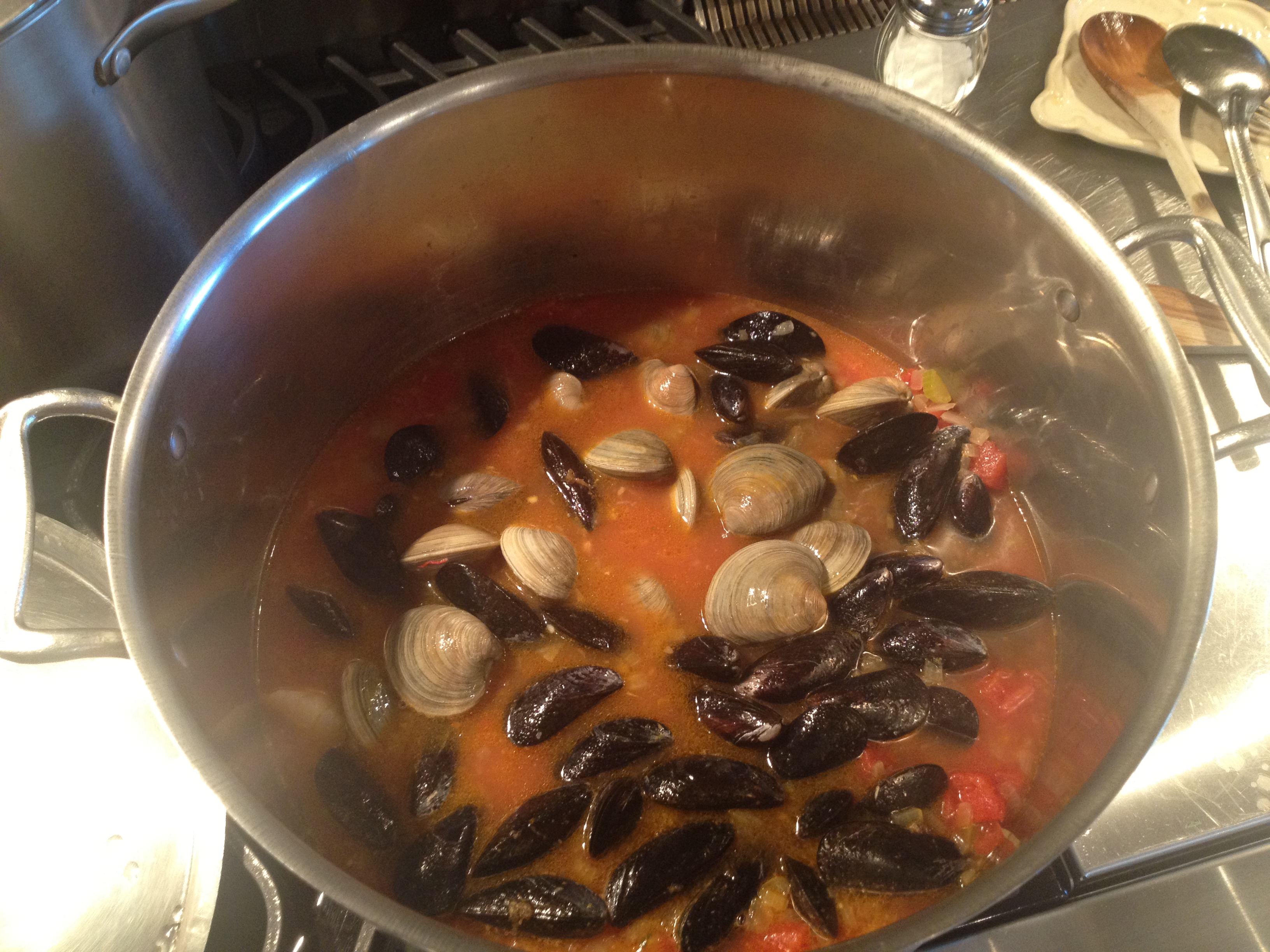 After 2 minutes or so, add the clams and mussels to the cooking liquid. Cover and cook until the clams and mussels begin to open, about 5 minutes.