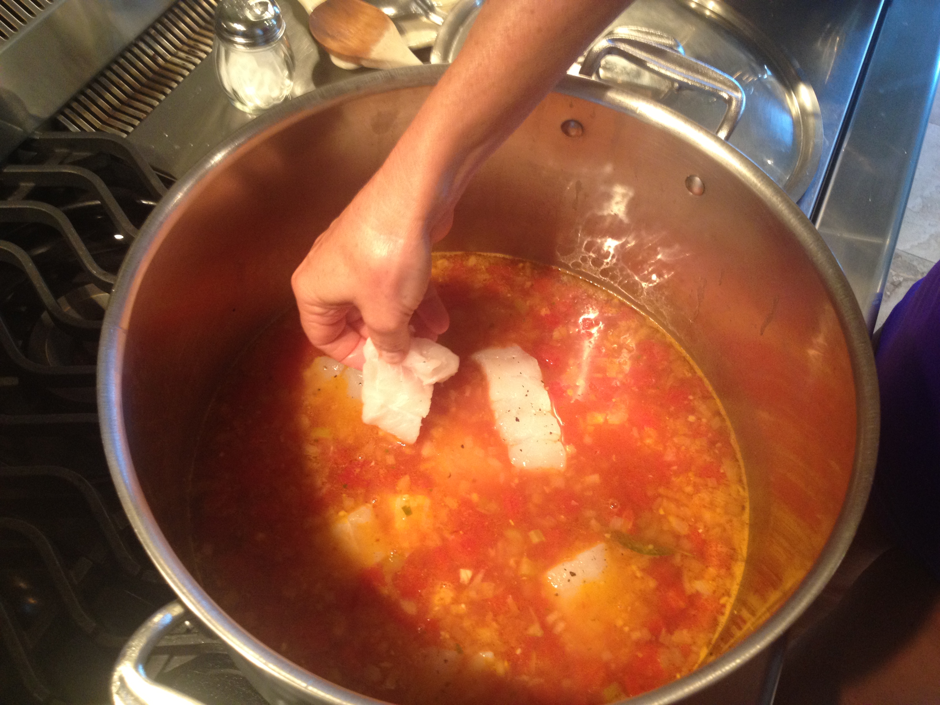Add tomatoes with their juices, wine, fish stock and bay leaf. Cover and bring to a simmer. Reduce the heat to medium-low. Cover and simmer until the flavors blend, about 30 minutes.