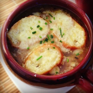 French onion soup is one of the only soups Kyle will enjoy so it’s a natural go to on a fall or winter day. There are many ways to make this soup and I tried to lighten it up by using half the amount of butter normally used. Substituting with a tablespoon of olive oil is a good way to cut down on some of the fat. It’s obviously not an overall light dish but this recipe won’t make you feel like you ate a pound of butter and cheese when you are done.