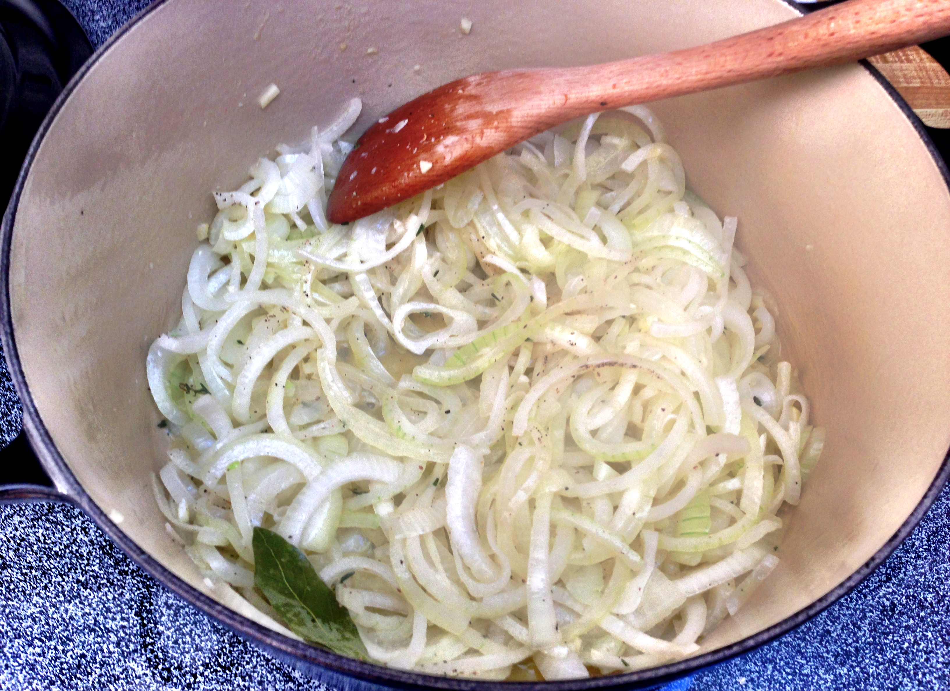 1 In a large saucepan, melt the butter and add olive oil on medium to high heat. Add the onions, salt, pepper, bay leaf and fresh thyme. Sauté the onions until they caramelize, about 30 minutes. Stir the onions occasionally.