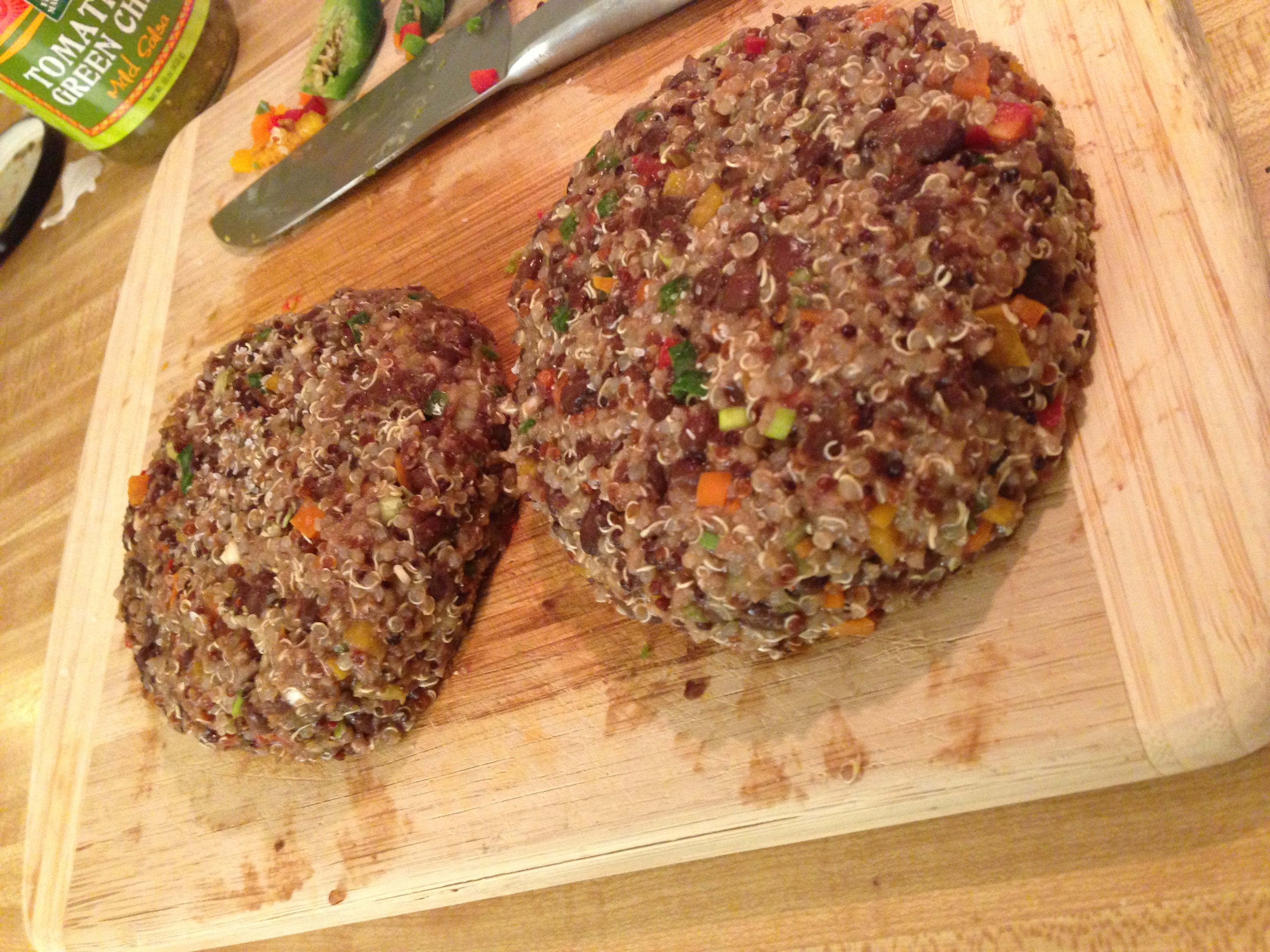 - Add the cooked quinoa and egg to the bowl and mix well. I made 2 very large burgers with these ingredients. It might be more manageable to make 4 smaller patties – but it’s your call.