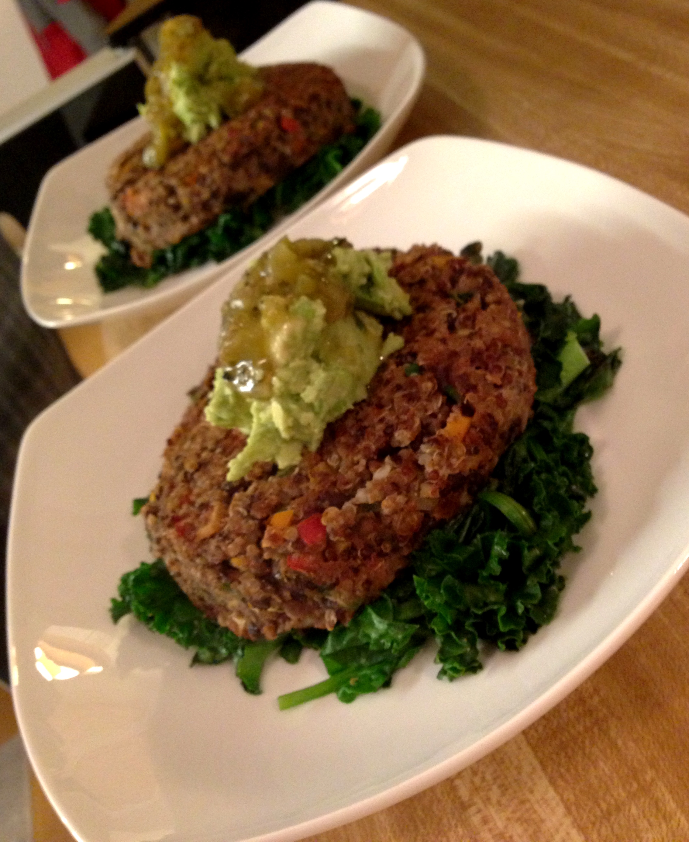 I love burgers especially those huge juicy, cheesy ones topped with tons of fun things! However, I am always willing to try new things–especially if means a healthy alternative. In anticipation of our vacation next week, I decided to stick with low carb and low-calorie meals. For that reason I opted to rest the burger on a bed of kale and spinach but I this would be phenomenal on a bun! I tried black bean burgers on their own which were delicious but the quinoa makes the burger a bit more hearty and filling. As far as toppings go, the options are endless. I went with a small scoop of guacamole and some tomatillo salsa I had on hand. You could do caramalized onions, a fried egg, sautéed mushrooms, cheese, and much much more.