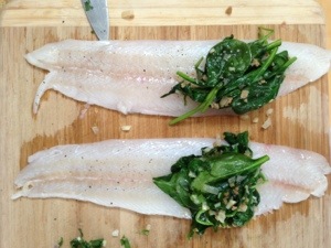 - Lay your fish flat and season with salt and pepper. Divide your spinach stuffing into 4 parts (for the 4 pieces of fish) and spoon the mixture on the end of your fish.