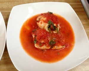 Add your tomato sauce (enough to just cover the fish) and sprinkle with fresh basil.