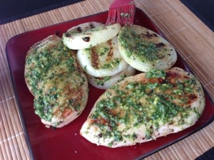 Brush the pesto on the chicken and onions and place on the grill (just a thin layer).