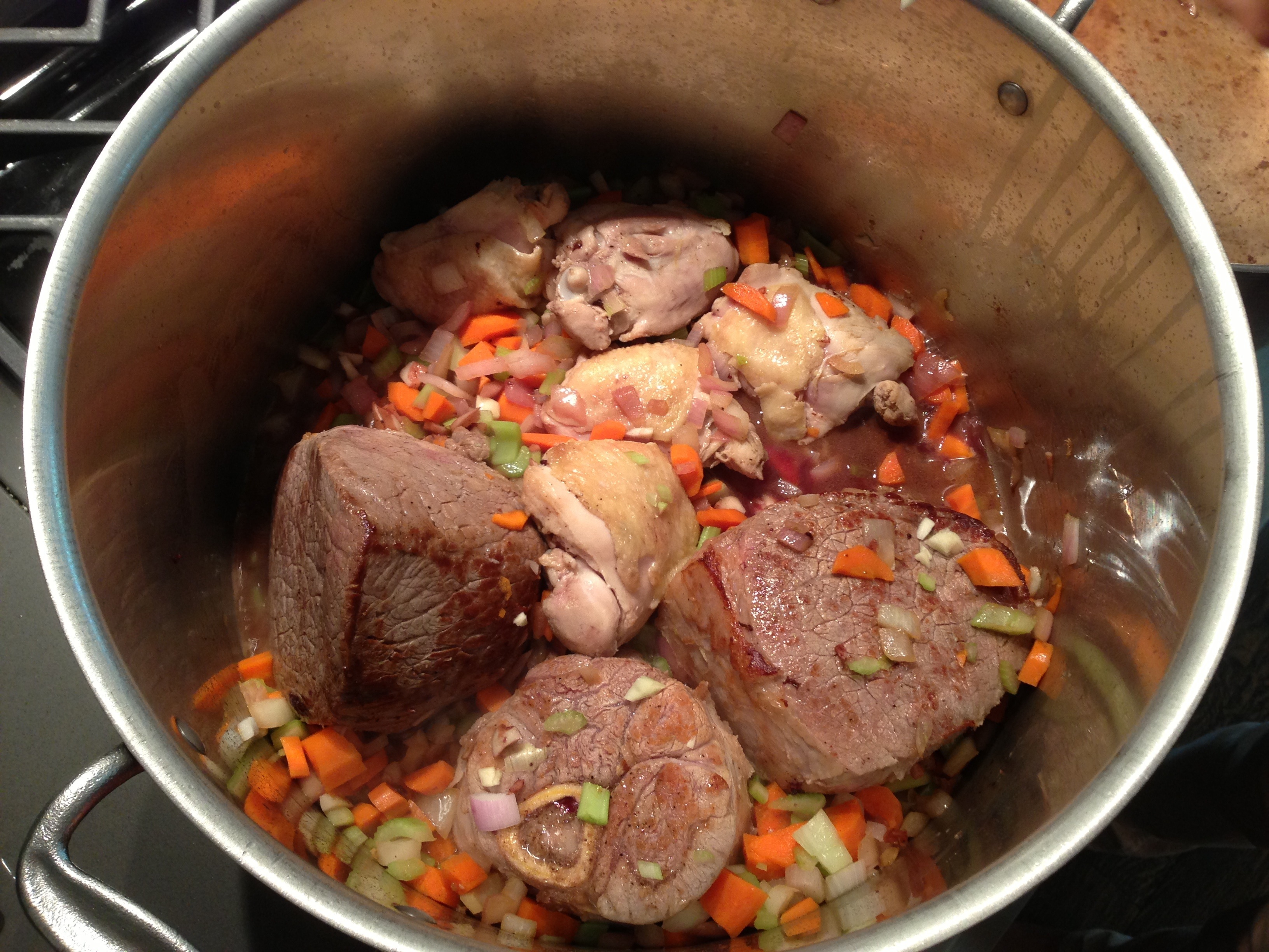 Simple: take the barbacoa recipe and insert Italian ingredients–like soffritto (combination of onions, carrots and celery). Also, add some other kinds of meats to inject a lot of flavor into the sauce. Mom and I set out to the grocery store in search of the perfect ingredients to make our version of this sauce. You can use any combination of meats and ingredients you would like and make this recipe your own! Here is (generally) how we made it. As usual, my measurements are rough. You can make this in a dutch oven like I do with the barbacoa, but since I didn’t have it with me at my parent’s house we made it on the stove without any problems!