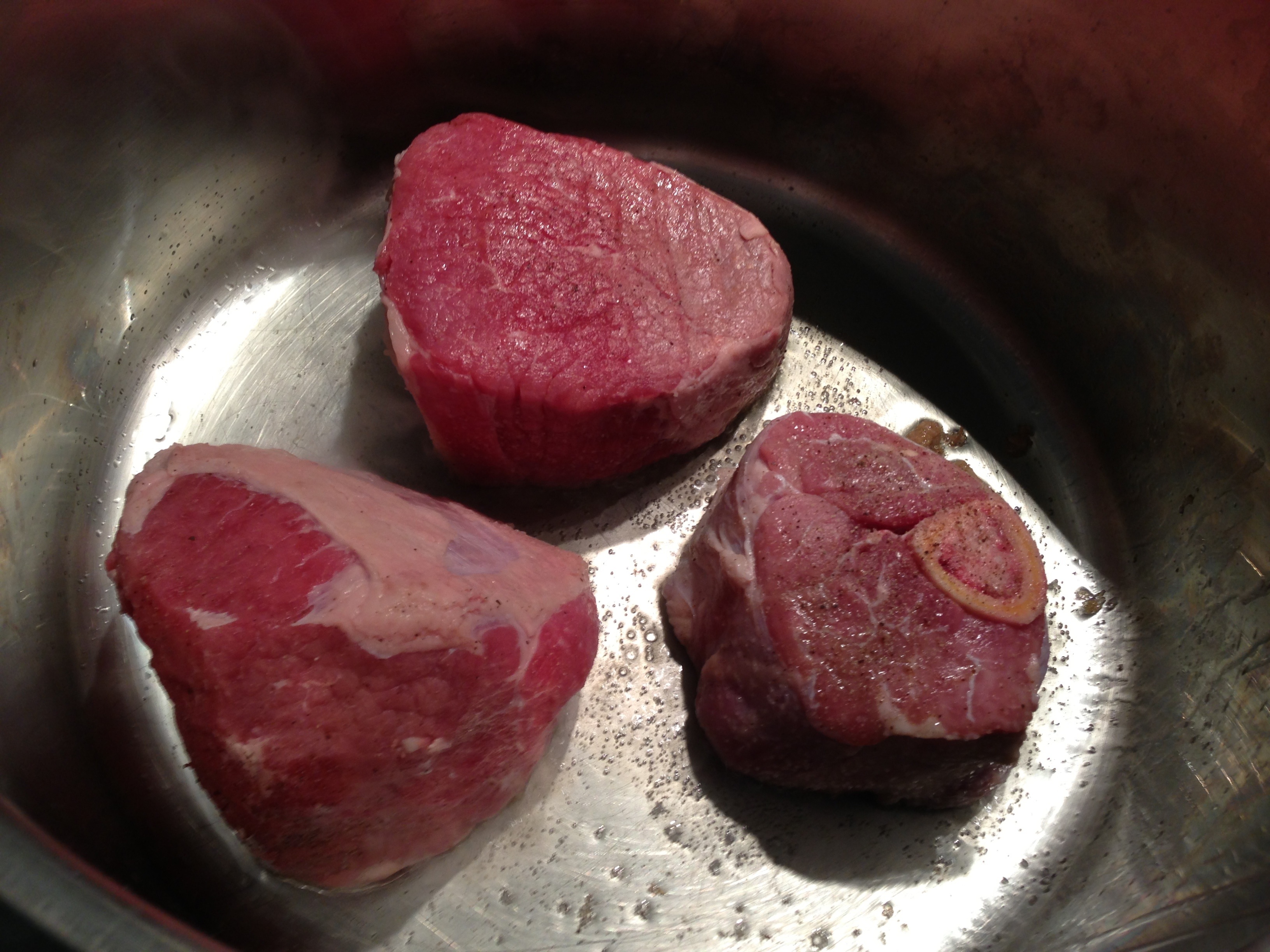 Start by bringing all the meat to room temperature and seasoning them with salt and pepper. Then saute your meats on high heat to get a nice brown coloring on all sides. If your pan isn’t large enough, sear your meat in batches. They need space to cook.