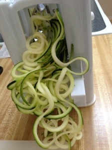 I bought a new kitchen toy! And I am REALLY excited about it. For $35 you can make pasta out of vegetables, too! This is a great way to eat pasta guilt-free and perhaps for the Moms out there, a great way to hide vegetables from your kids! And if you are gluten free this is a great substitute for pasta–certainly more nutritious AND tasty !