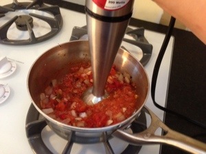 Puree the mixture with your hand mixer. I left mine as more of a chunky salsa rather than puree everything together to a smooth sauce.