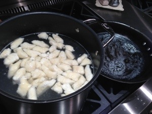 Cut log crosswise into 1-inch pieces. Place gnocchi on prepared baking sheet, spacing apart. Repeat with remaining dough. Cover gnocchi with plastic wrap and chill at least 1 hour or up to one day. ( Ours chilled for maybe a half hour and we cut them afterwards)