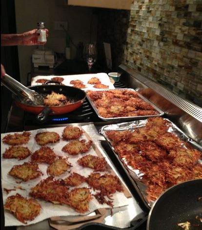 Latkes. Fried potato goodness dipped in sour cream and/or apple sauce. We eat them once a year on Hanukkah. They are worth every single calorie and every minute of frying. Of course if you are only cooking for a small family, it’s not that labor intensive. But if you are like us, and want to make 70+ latkes, it takes a bit of time…