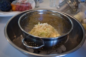 Put the mixture in a large strainer and add flour, salt, pepper and baking powder. Add flour in little by little and mix well. You will need to add more flour- you don’t want the mixture to be really wet. Allow the liquid to drip through the strainer.