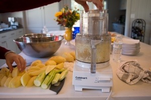 Peel and rinse potatoes in cold water. Half the potatoes to fit in the grater and then grate the potatoes and onion- I recommend a food processor with a grating disc. You can do them by hand but why bother? We use the julienne grater so our latkes have texture. Otherwise they’re like mush.