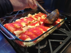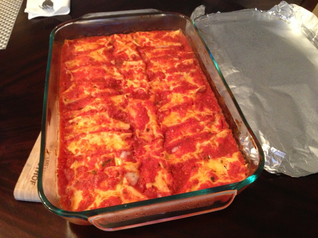Each year for Christmas day, Mom and I like to take on a cooking challenge. We have all day, we aren’t getting out of our pajamas, so why not cook something fun? We made just under 100 manicotti and of course froze some for Nanny and other family members. In my opinion, if you are going to put in the work, you might as well make a lot. We paired them with roasted racks of lamp chops (recipe to come later) and sautéed zucchini–a well-balanced holiday meal that hit the spot! These delicate cheesy bites of heaven will satisfy any crowd and you can have fun doing it!