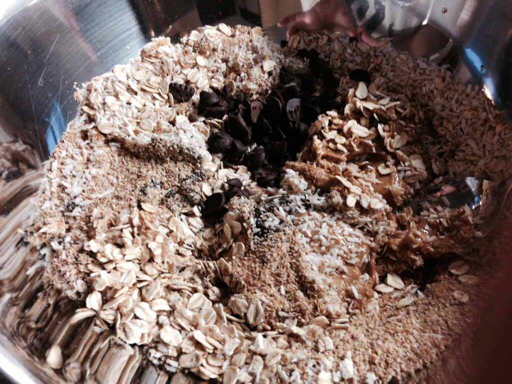 Put all ingredients in a bowl and mix together. Place in the refrigerator for 20 minutes or so to get everything cold. Then roll them into balls. Store in an airtight container in the refrigerator and eat one for your late afternoon snack!