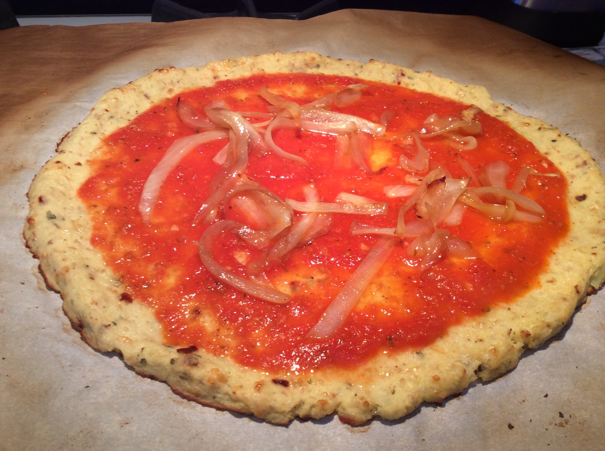 - I topped mine with some leftover homemade sauce, caramelized onions, reduced fat mozzarella cheese, a sprinkle of parmesan cheese and of course some spicy soppressata.