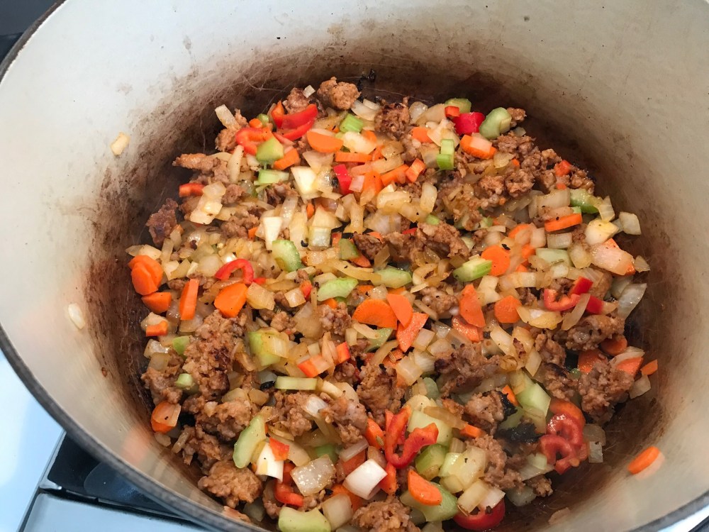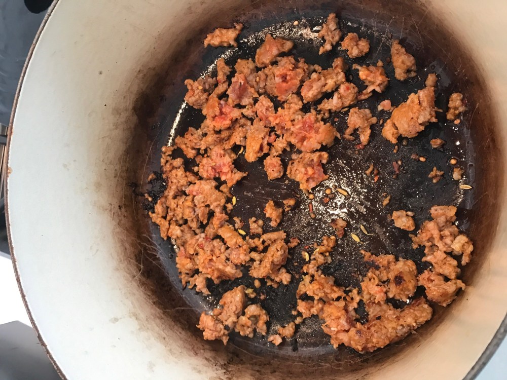 Get your large soup pot on medium to high heat, add a little oil and add your sausage. Break it up into tiny pieces with a wooden spoon and brown it.Add in the fennel seeds now if you’re using them.