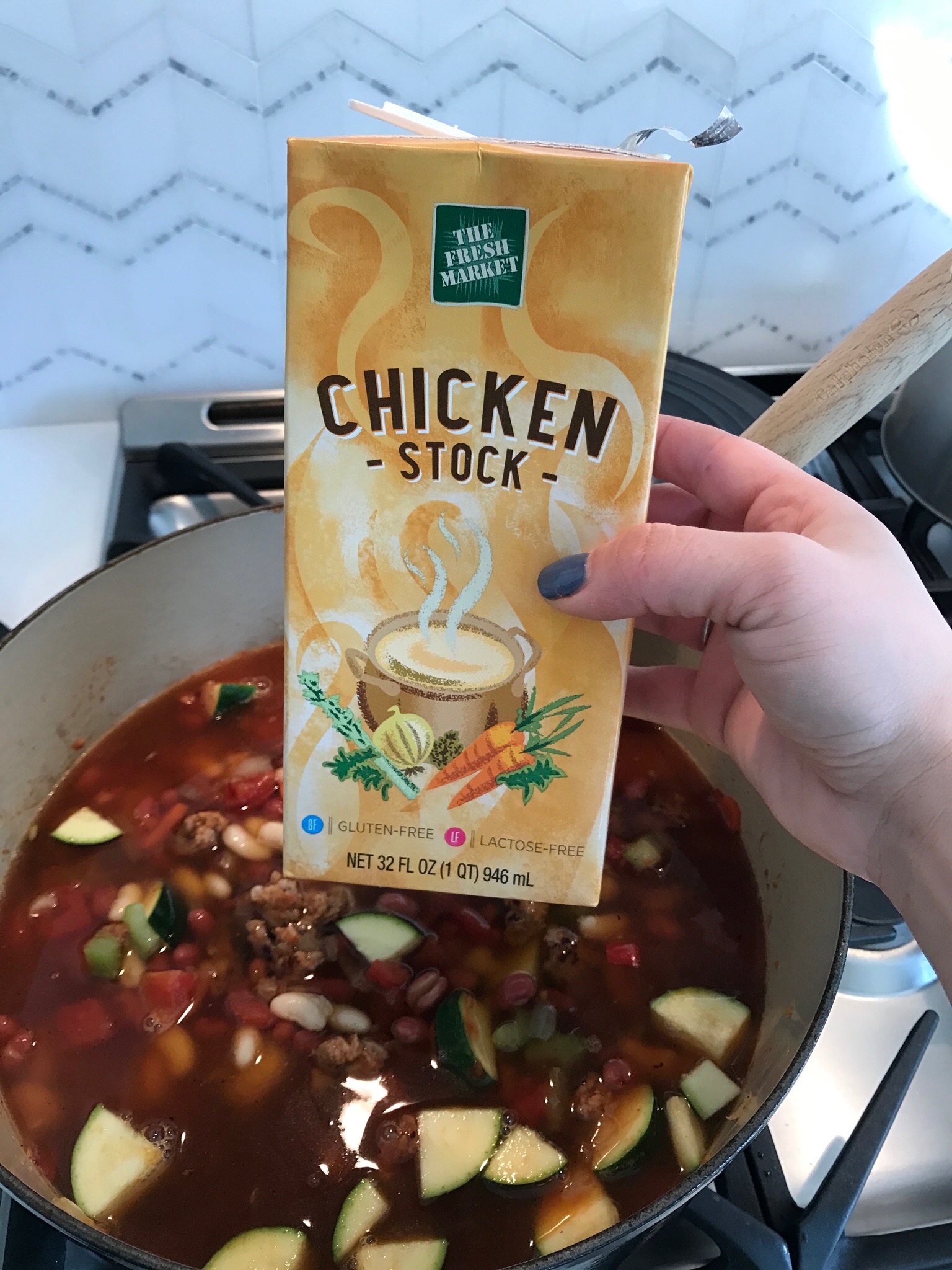 Add in any chicken broth or stock you have on hand. You can also use veggie instead.