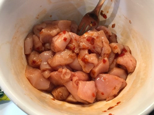 - First start by marinating your chicken in soy sauce, a dash of sesame oil, fresh grated garlic, chili paste (if you like spice) fresh grated ginger and a sprinkle of salt