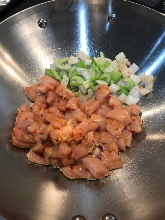 Next goes in your chicken and stir. You want to brown all sides of the chicken.