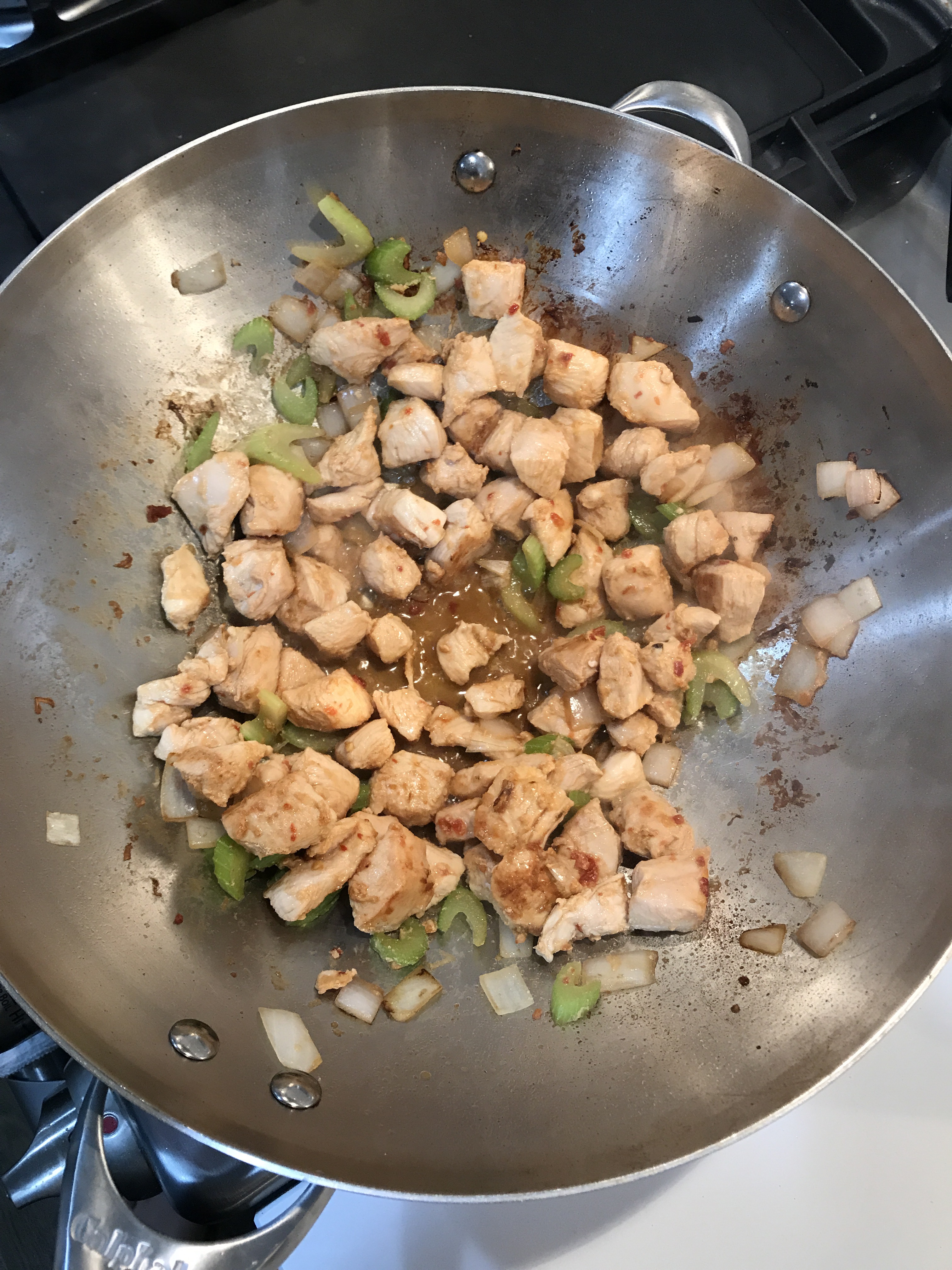 Add sesame oil to a hot wok and add in your onions, stir for a minute and then celery. Let cook on high heat for another minute or two.
